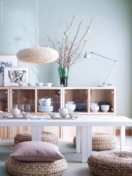 這張圖是采取折衷的辦法,并沒有完全采取“席地而坐”的家具,有些時候我們在考慮整體搭配的時候,可以選擇一些實用的低矮家具單品,來達到想要的效果。