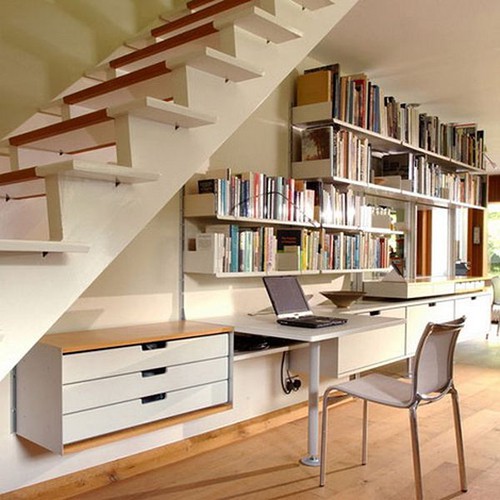 九十度的墻角除了積灰之外就剩下難清潔的特點(diǎn),真是讓人頭疼的存在。裝上一個(gè)墻角書架,將尷尬的角落變成獨(dú)特的收納位置,若是做成懸空的,底下還能放上一張辦公桌,可以節(jié)省下更多的空間。