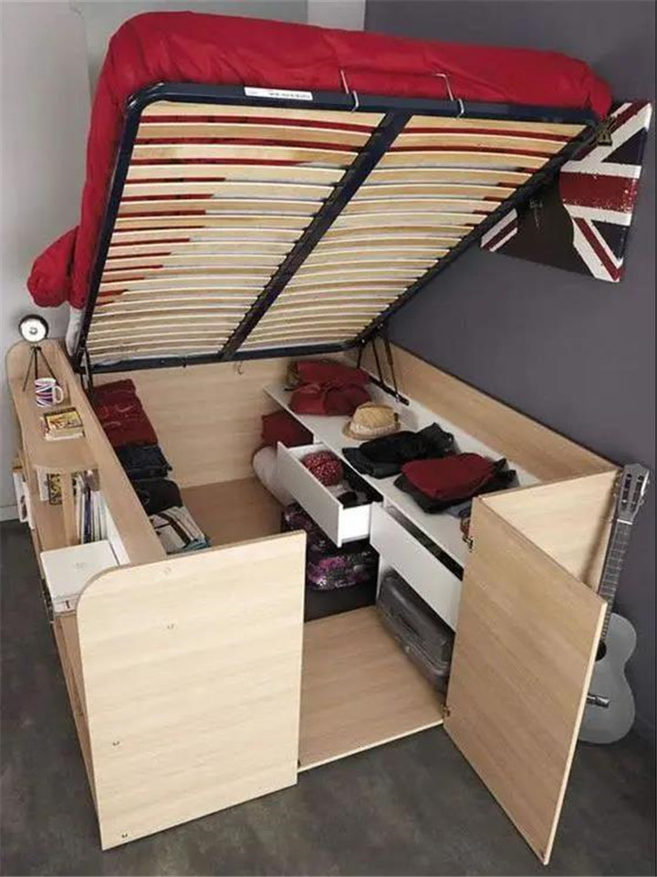 小臥室還可以選擇高箱床的設(shè)計,床架跟正常的床一樣,比較透氣,下面設(shè)計成一個箱體,用來儲物。