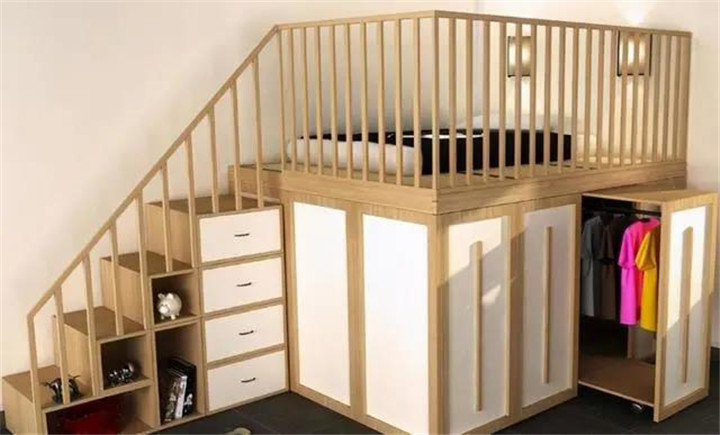 把床再抬高一點,人可以直立進去,床下面設(shè)計成小儲藏室,安裝置物架,用來收納衣服和雜物。