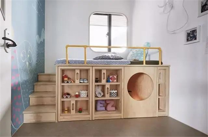 上面是床,下面是儲物柜,可以設(shè)計成平開門的衣柜,或者抽屜,1米以下的高度更加適合小孩使用。