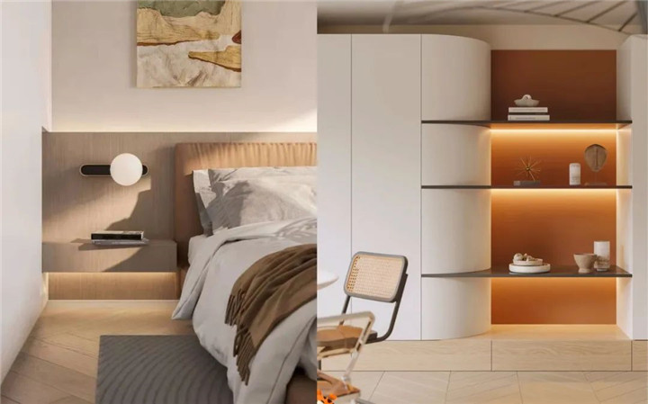 奶油風(fēng)的背景墻一般采用的,石膏造型或者木飾面、木格柵造型比較多,通常在造型的邊上設(shè)置暗藏?zé)魩?,既能體現(xiàn)更加高級(jí)感的照明氛圍,同時(shí)也能夠增加燈光的層次感,柜體的暗藏?zé)魩б餐瑯尤绱?,讓開放格內(nèi)部的燈光更具備層次,既保證照明效果,也具備高顏值氣質(zhì)。