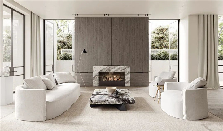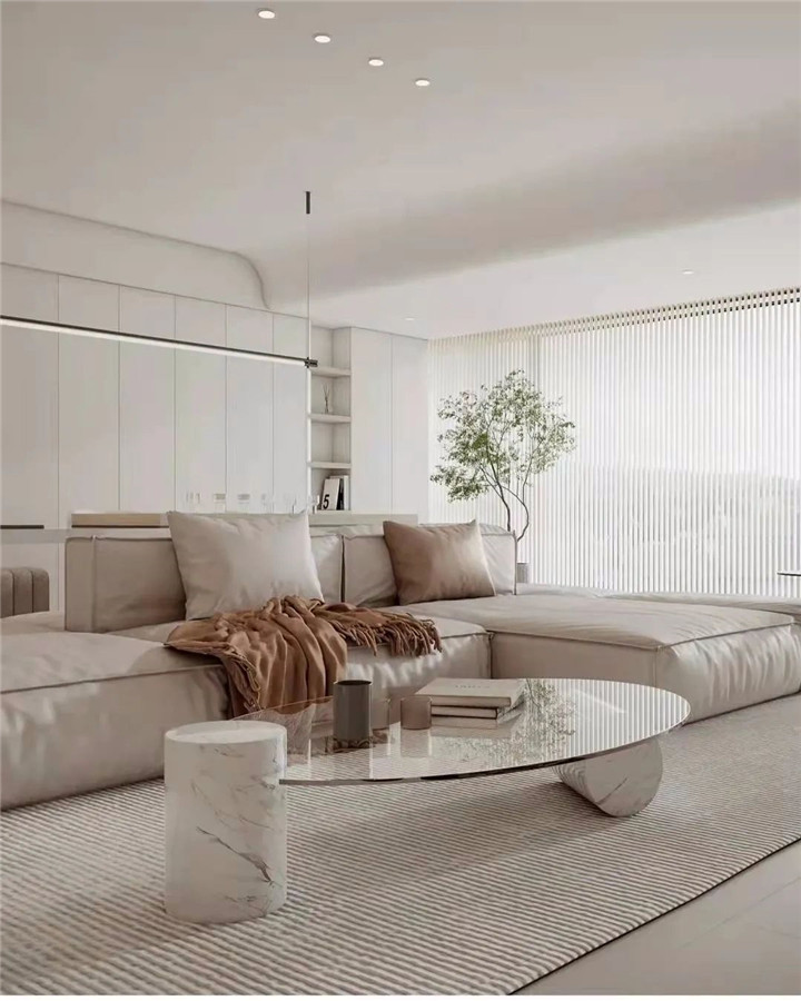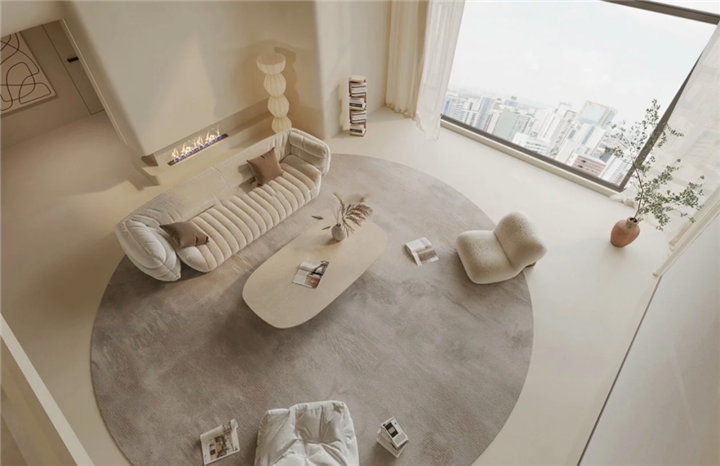 材質(zhì)方面為了符合奶油系風(fēng)格的調(diào)性,在選擇上,一定要盡量選擇肌理感較強(qiáng)的材質(zhì),比如羔羊絨、珊瑚絨、棉麻、原木等材質(zhì)最為適合。