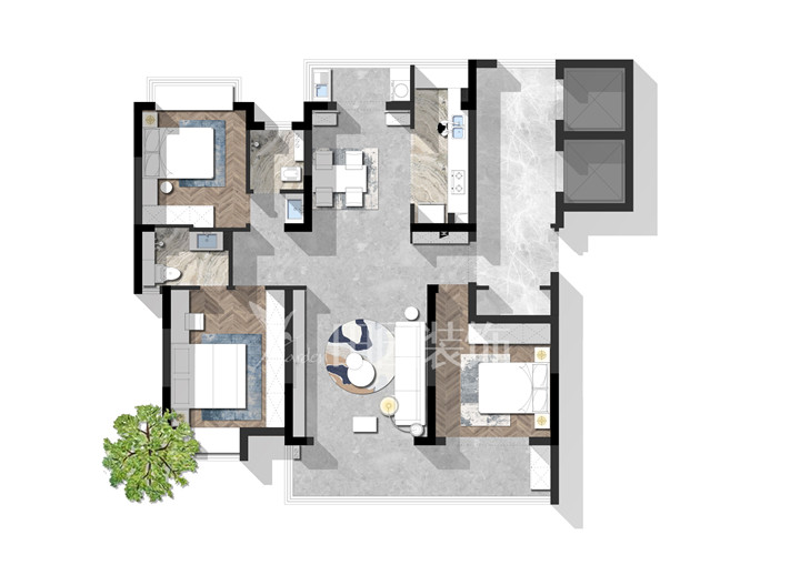 1、原始結(jié)構(gòu)改動(dòng)較少,保留三室的情況下,擴(kuò)寬廚房,讓整個(gè)空間更加合理化。