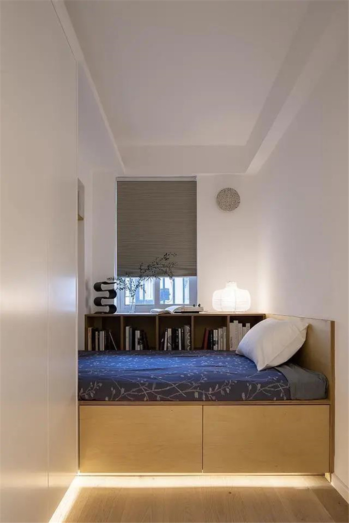 如果小臥室真的特別小,擺不下一張正常的床,并且又有強大的儲物需求,那可以參考一下“儲物柜+床”或者“高箱床”的設(shè)計,床下面的儲物空間設(shè)計成抽屜或者拉柜更加實用。
