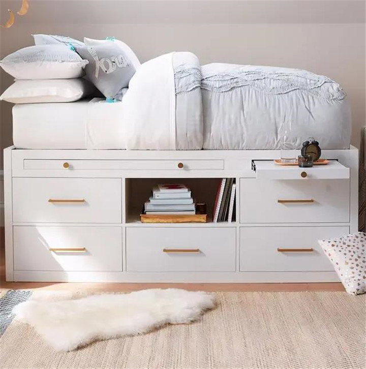 床下面設(shè)計隱藏式抽屜,拉出來就是一張桌板,方便小孩子寫作業(yè)。