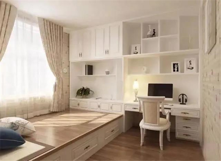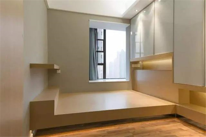 近幾年,小臥室比較流行的裝修就是設(shè)計成榻榻米,像圖片這樣,設(shè)計成床、柜子、書桌連在一起的,充分利用空間,房內(nèi)還有一定的活動空間。