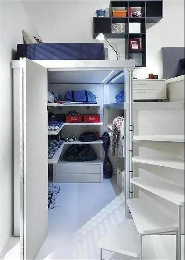把床再抬高一點,人可以直立進去,床下面設(shè)計成小儲藏室,安裝置物架,用來收納衣服和雜物。