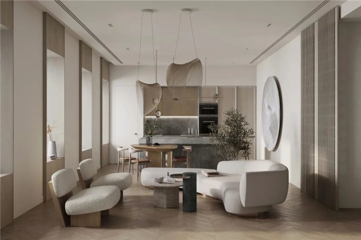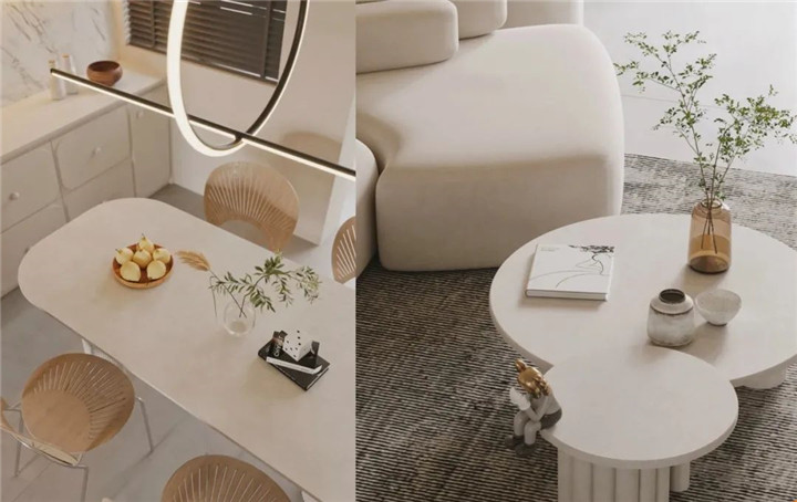 如果選擇千篇一律,棱角分明的桌柜茶幾,只會(huì)讓整體的氛圍感覺沉重、生硬,而在家具的造型上可以有更豐富的設(shè)計(jì)感,桌子茶幾等等可以采用曲線弧形,或者不規(guī)則的曲線線條,也可以傾向于橢圓、正圓等等,這些充滿流暢線條感的造型,讓整體氛圍更加靈動(dòng)。