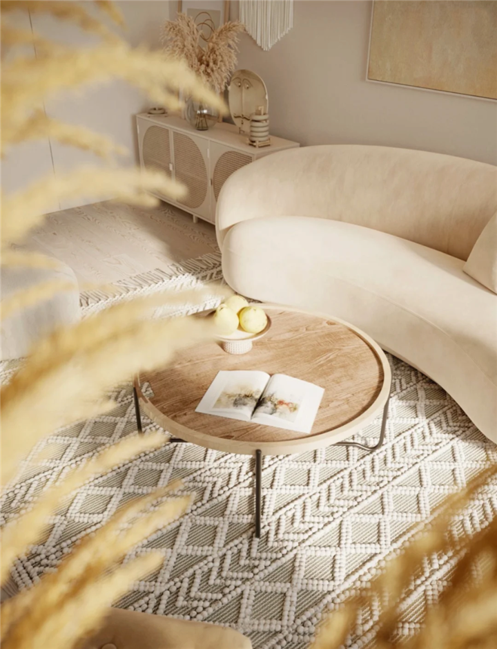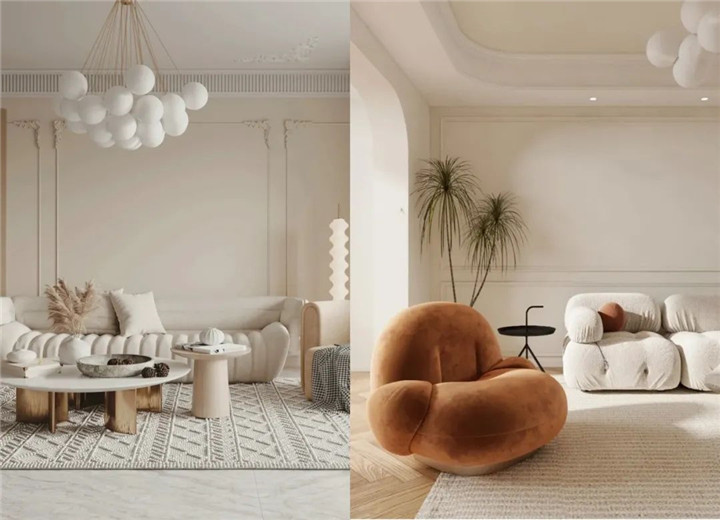 材質(zhì)方面為了符合奶油系風(fēng)格的調(diào)性,在選擇上,一定要盡量選擇肌理感較強(qiáng)的材質(zhì),比如羔羊絨、珊瑚絨、棉麻、原木等材質(zhì)最為適合。