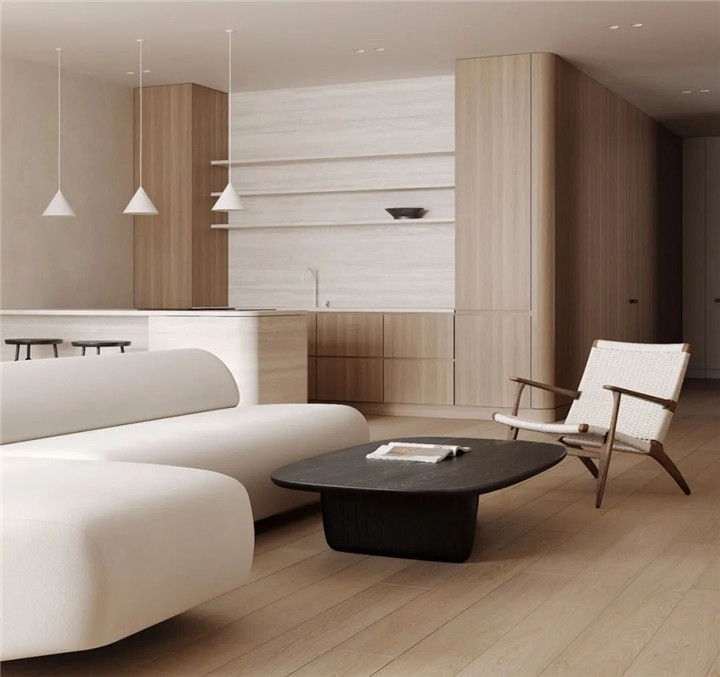 奶油風(fēng)的地面追求自然原始的質(zhì)感,一般使用原木或橡木的地板,并且通過(guò)通鋪的方式,擴(kuò)大視覺延伸感,選用的木色一般比墻面略深一些,更加凸顯沉穩(wěn)感和層次感,烘托低調(diào)高級(jí)的氛圍,也方便突出其表面陳設(shè)的家具。